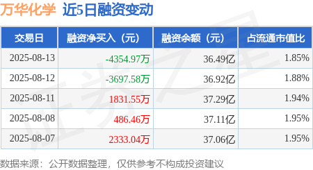 本站消息,8月13日,万华化学(600309)融资买入1.93亿元,融资偿还2.37亿元,融资净卖出4354.97万元,融资余额36.49亿元,近20个交易日中有11个交易日出现融资净买入。